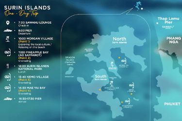 Experience the unspoiled beauty of the Surin Islands, a remote tropical paradise known for crystal-clear waters, vibrant coral reefs, and rich marine life. Travel by speed catamaran and enjoy a full day of snorkeling, beach relaxation, and cultural discovery. Visit the traditional Moken (Sea Gypsy) Village, snorkel at breathtaking spots such as Pineapple Bay, Mae Yai Bay, and Ao Sapparot, and enjoy freshly prepared meals during the journey. This trip is ideal for travelers seeking nature, adventure, and an authentic island escape.