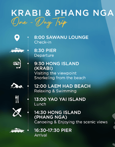 Experience the diverse beauty of southern Thailand on our Krabi & Phang Nga One-Day Trip, combining scenic islands, turquoise waters, and iconic limestone landscapes. This full-day journey takes you to Hong Island (Krabi) for panoramic viewpoints and beach snorkeling, followed by relaxing time at Laem Had Beach and lunch on Yao Yai Island. Continue the adventure at Hong Island (Phang Nga) with peaceful canoeing through stunning natural scenery before returning to the pier. This trip is ideal for travelers seeking a perfect mix of sightseeing, relaxation, and soft adventure in one unforgettable day.